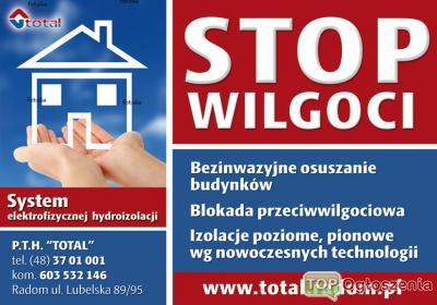 Montaż aparatów odbywa się podczas normalnej eksploatacji budynku, bez wykonywania jakichkolwiek prac budowlanych, bez względu na porę roku i warunki atmosferyczne. Metoda jest skuteczna dla każdej grubości murów i różnych materiałów budowlanych (cegła, kamień, mur mieszany), jest niezależna od promieniowania ziemskiego, działa na wszystkie ściany budynku będące w promieniu działania aparatu, jest tańsza od metod tradycyjnych, można zrezygnować z zastosowania środków chemicznych i ich działań ubocznych, usuwa na stałe wysoką wilgotność powietrza oraz przykry zapach, likwiduje pleśnie i grzyby, zmniejsza koszty ogrzewania, zapobiega dalszym szkodom budowlanym. Po uzyskaniu naturalnego zawilgocenia murów system ELEKTROFIZYCZNEJ HYDROIZOLACJI powoduje trwałe zachowanie tego stanu, zapobiegając ponownemu kapilarnemu podchodzeniu wilgoci. Po osuszeniu można przeprowadzić remont uszkodzonych przez wilgoć murów. Aparaty osuszające objęte są 20 LETNIM OKRESEM GWARANCJI !!!