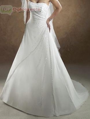Mam do sprzedania piękną, jednoczęściową, śnieżnobiałą suknię ślubną z pięknym delikatnym trenem, wzorowaną na amerykańskiej sukni firmy Maggie Sottero ozdobionej kamieniami Swarovskiego.