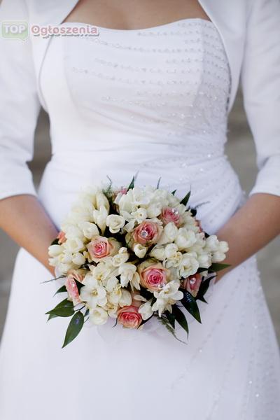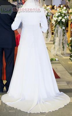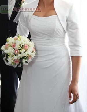 Dołączam GRATIS bolerko, specjalnie szyte i dopasowane do sukni, ozdobione kryształkami na rękawkach, długość rękawków 3/4. Do sukni dołączam GRATIS także buty - białe klasyczne szpilki rozm. 40.